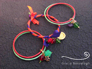 Tintinnanti bangles indiani, uniti da colorati e luminosi charms e un bangle centrale rivestito in raso a mano, con charms e applicazioni in satin. Un modello del tutto versatile e origimale... un modo nuovo di indossare i charms.